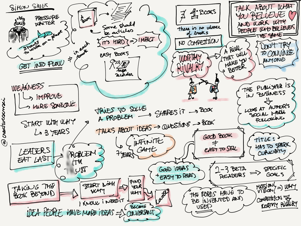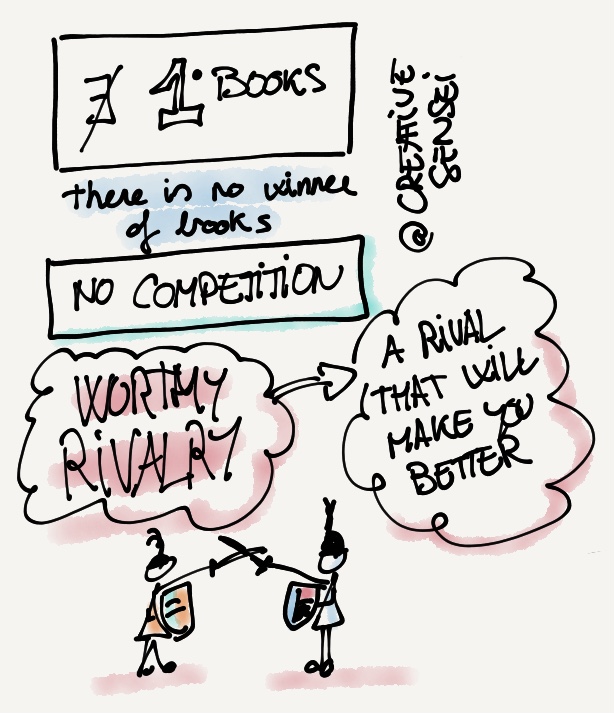 Cómo a veces encuentra un problema, intenta resolverlo y luego compartirlo, en forma de libro, como el problema con la confianza que reflexiona en Los líderes comen al final. Y cómo, otras veces, puede estar hablando de algunas ideas, encontrando respuestas a varias preguntas en un libro, como en El juego infinito. Me gustó mucho el entorno no tan competitivo que describe como «rivalidad digna» (en la que el oponente te ayuda a ser mejor), ya que suscitó alguna imagen particular que tuve que plasmar en mis notas.